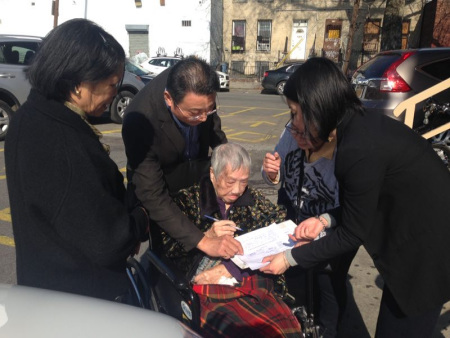 早上8點(diǎn)多開始,布魯克林亞裔社團(tuán)聯(lián)合總會(huì)所在的金皇庭酒樓一層大廳就涌進(jìn)了大批辦證僑胞,年長(zhǎng)僑胞在親友的陪同下來到這里,在總領(lǐng)館領(lǐng)事和亞總會(huì)志愿者的指引下,拿號(hào)排隊(duì),有序辦證。