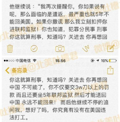 而去年2月,即已有留學(xué)生因?yàn)槲⑿帕奶熘械囊痪湓挾磺卜担?016年2月26日,一位中國女留學(xué)生曾因大半年前在微信中向朋友透露,“我不喜歡這個(gè)學(xué)校,只是臨時(shí)掛一下身份”,沒想到這段久遠(yuǎn)的聊天紀(jì)錄,竟然在入境美國時(shí)被海關(guān)看到,被盤問三個(gè)多小時(shí)后,她立即被遣返回中國。