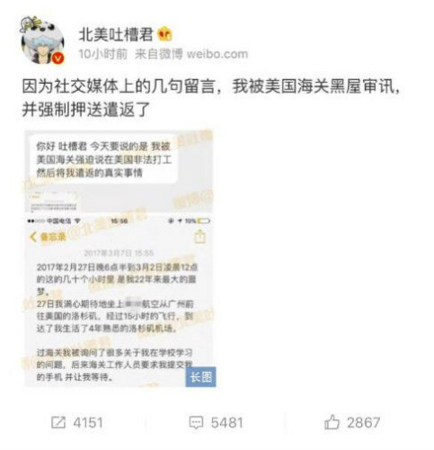 “高宇仁”描述的過程看上去有些可怖:據(jù)她介紹,她是一名22歲的中國赴美留學(xué)生,在今年2月27日從中國返回美國準(zhǔn)備完成最后一年的大學(xué)學(xué)業(yè)時(shí),卻被美國機(jī)場的海關(guān)人員反復(fù)詢問,并被關(guān)進(jìn)“小黑屋”進(jìn)行搜身。