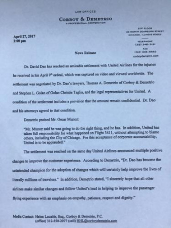 當(dāng)?shù)貢r(shí)間4月27日14點(diǎn)(北京時(shí)間28日凌晨3點(diǎn)),負(fù)責(zé)代理美聯(lián)航暴力拖拽乘客下飛機(jī)一案的律師德梅特里奧給包括央視記者在內(nèi)的媒體發(fā)來(lái)郵件,稱美聯(lián)航已與遭暴力拖拽下飛機(jī)的乘客David Dao達(dá)成和解協(xié)議。但作為條件之一,協(xié)議的具體內(nèi)容和涉及的金額保密。