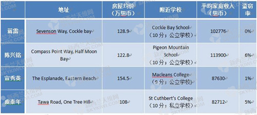 這還不是最夸張的。以上四人所住的街區(qū),房屋均價全部超過100萬。其中宣秀英所在的The Esplanade是奧克蘭東區(qū)Eastern Beach的一條著名海濱大道,全部都是“面朝大海春暖花開”的海景豪宅。2017年的市場均價在155萬紐幣(約合775萬人民幣)。
