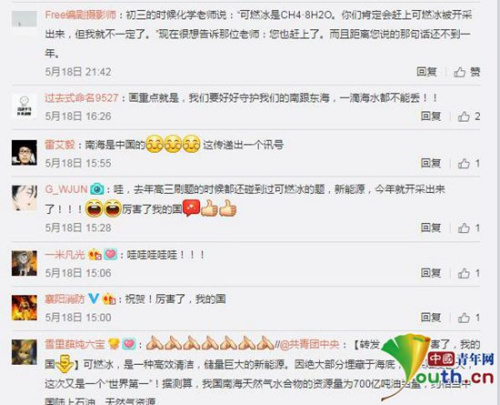 “厲害了,我的國!那么高難度的可燃冰竟然被中國地質(zhì)開采出來了,中國的NO。1,世界的NO。1,為你們喝彩,為你們驕傲!”網(wǎng)友@陳倉大漠雄鷹通過中國青年網(wǎng)官微留言,表達(dá)對(duì)國家科技進(jìn)步發(fā)展的驕傲之情。