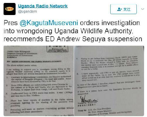 時(shí)間回到5月2日,穆塞韋尼總統(tǒng)要求總監(jiān)察長對(duì)烏干達(dá)野生動(dòng)物管理局進(jìn)行調(diào)查。他在寫給后者的信中稱,有兩名中國駐烏大使館官員涉嫌與該管理局的人員勾結(jié),把烏干達(dá)作為中轉(zhuǎn)站走私象牙。