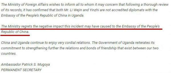 為緩和因此緊張的兩國外交關(guān)系,烏干達(dá)政府于12日發(fā)布聲明文件,向中國道歉。