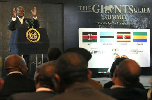 烏干達(dá)總統(tǒng)穆塞韋尼在2016年4月的一場反盜獵活動(dòng)上發(fā)表講話。