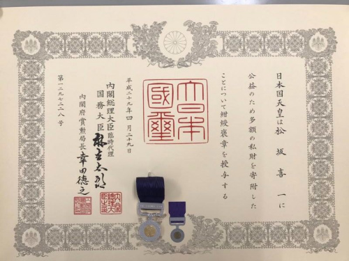 2017年4月29日,日本天皇正式授予陳熹紺綬褒章和獎(jiǎng)狀,獎(jiǎng)狀上寫著“日本天皇授予為公益捐獻(xiàn)多額私財(cái)?shù)乃邵嘞惨唤C綬褒章”,上蓋極為少見的日本國(guó)璽。