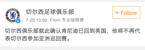 隨后,切爾西官方證實(shí)了此消息稱,切爾西俱樂(lè)部就此確認(rèn)肯尼迪已回到英國(guó),他將不再代表切爾西參加亞洲巡回賽。