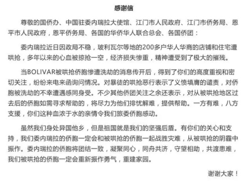 委內瑞拉華助中心幫助遭受哄搶僑胞募捐錢物,并向各方致感謝信。