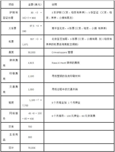 首先,也是最為重要的用途,就是用于支持尋找瑩穎的開(kāi)銷(xiāo),其中包括懸賞費(fèi)用、交通費(fèi)、印刷費(fèi)、以及正在計(jì)劃之中的雇傭?qū)<摇商降馁M(fèi)用等等。其次,用于支付在案件審理過(guò)程中所有的律師費(fèi)用,目前有些律師為了我們提供了免費(fèi)的法律援助,例如王志東律師和Steve Beckett律師,但也有律師是收取費(fèi)用的,例如Roaa Al-Heeti律師;同時(shí)案件的審理過(guò)程預(yù)計(jì)會(huì)持續(xù)1到2年時(shí)間甚至更久,在未來(lái)的時(shí)間里,很可能出現(xiàn)更多法律方面的開(kāi)支。第三個(gè)用途,是支持家人在美國(guó)的生活開(kāi)銷(xiāo),包括租房費(fèi)用、飲食費(fèi)用等。第四,用于支持瑩穎父母的未來(lái)生活,瑩穎是家族中唯一一個(gè)大學(xué)生,她的身上傾注著父母太多心血和希望,家庭的未來(lái)因?yàn)檫@次災(zāi)難徹底地改變了,父母不僅是在美期間無(wú)法工作,即使在找到瑩穎之后的一段時(shí)間內(nèi)也很難投入到正常的工作和生活中去,尤其瑩穎父親的職業(yè)是貨車(chē)司機(jī),工作需要高度的專(zhuān)注;同時(shí),改善拮據(jù)的家境也是瑩穎一直以來(lái)奮斗的目標(biāo)和動(dòng)力。