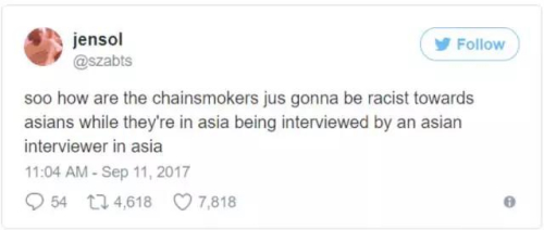 “煙鬼組合就這樣在亞洲接受一個亞洲人訪談的時候,對亞洲人進(jìn)行了種族歧視……”