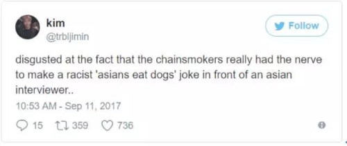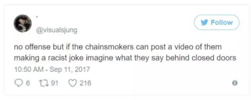 關(guān)心歐美流行音樂的朋友可能聽說過這樣一個美國電子音樂組合:Chainsmokers(煙鬼組合)。這兩天,這個組合可是有點麻煩,因為它的兩大主唱之一亞歷克斯·鮑爾陷入了一場“辱華”危機。