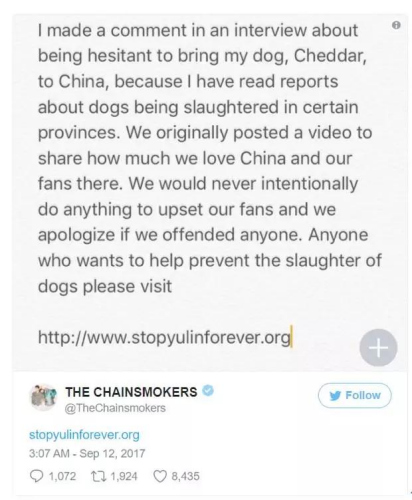 “在一個訪談中,我談到了我對是否能把我的狗Cheddar帶到中國來感到猶豫,因為我以前看過一些說中國某些省份屠殺狗的報道。我們起初po這個視頻是為了和大家分享我們有多愛中國還有我們在那里的粉絲。我們絕不是故意要惹惱我們的粉絲的,如果我們冒犯了什么人,我們向他們道歉。如果有人想幫助一起阻止屠殺犬類,請訪問如下網(wǎng)站:http://www.stopyulinforever.org”