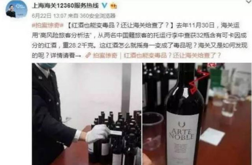 2名中國人受朋友委托帶兩箱紅酒回中國,海關(guān)入境邊檢人員當(dāng)場查出紅酒中藏有毒品(液體含可卡因)!