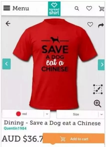 今年3月,Spreadshirt的德國官網(wǎng)上出售印有“吃中國人”內(nèi)容的T恤。