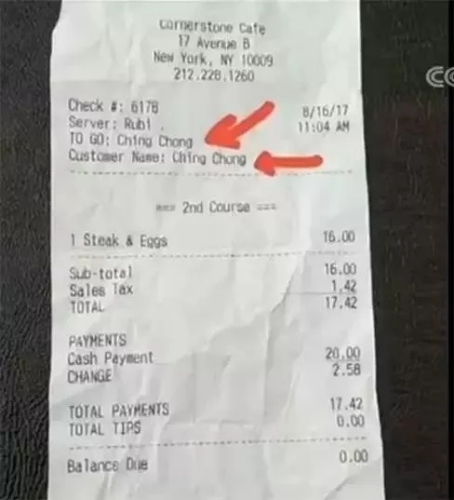 收據(jù)中有英文詞匯“Ching Chong ”(意為“中國佬”),是在模仿和嘲笑中文的發(fā)音,而其中所蘊含的美國史上“排華浪潮”等歷史因素,更加深了它的侮辱性。