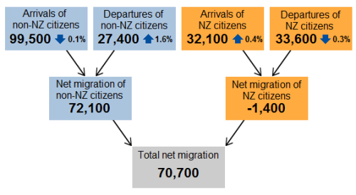 今年有72100位非新西蘭公民抵達,離開的新西蘭公民有1400人。新西蘭近幾年見證了移民的破紀錄增長,移民問題也成為大選的熱門話題。因為新西蘭的基礎設施無法跟上人口增長,移民被認為是推高房價的“罪魁禍首”。