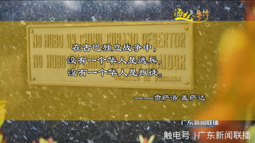 在蔣老先生的指引下,我們來到哈瓦那海濱大道街心花園。一座黑色大理石紀念碑靜靜地佇立在花園里,上面刻著古巴獨立戰(zhàn)爭時期的將軍貢薩洛·蓋薩達的一句話:“在古巴獨立戰(zhàn)爭中,沒有一個華人是逃兵,沒有一個華人是叛徒?!惫虐腿嗣駥Κ毩?zhàn)爭中華人的英雄行為和高尚品質非常崇敬,于是建立“華人記功碑”以紀念華人所做的巨大貢獻。(來源:廣東廣播電視臺“觸電新聞”客戶端)