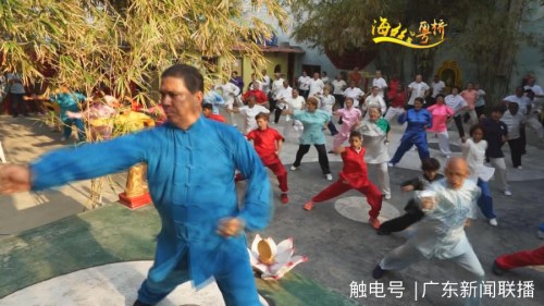 這位身穿藍(lán)色練功服,像個(gè)武教頭一樣,大聲喊口令的古巴人,中文名叫李榮富。他是古巴武術(shù)學(xué)校的校長(zhǎng),也是創(chuàng)始人。每天清晨,他都會(huì)帶著學(xué)員操練一個(gè)小時(shí)。得知電視臺(tái)要來(lái)拍攝,他和弟子們輪番上陣,展示武術(shù)絕活。