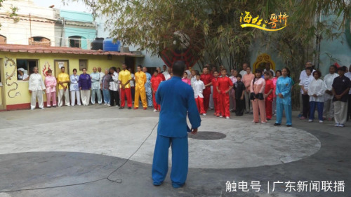 在哈瓦那老城區(qū)的圣尼古拉斯街附近,一陣熟悉的中國(guó)音樂(lè)從小巷子里傳出。我們循聲找去,來(lái)到一處院落跟前。明黃色的院墻上,兩個(gè)大大的太極圖格外醒目。向?qū)дf(shuō),這里便是我們要采訪的武術(shù)館了。