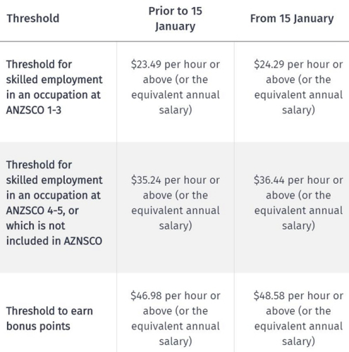 從表中可以看到,對(duì)于ANZSCO 1-3的中等技能工種,小時(shí)薪門(mén)檻從目前的19.97紐幣上調(diào)到20.65紐幣。較高的技術(shù)工種(不分職業(yè),包括ANZSCO 4-5)小時(shí)薪門(mén)檻從目前的35.24紐幣上調(diào)到36.44紐幣。