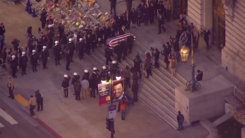 葬禮的隊伍驅(qū)車經(jīng)過了舊金山數(shù)條街區(qū),其中包括李孟賢生活居住的格林公園(Glen Park)區(qū)域。當(dāng)棺木被抬上臺階進入市政大廳時,守護兩旁的警察和現(xiàn)場的民眾都靜靜地默哀祈禱,不少人不禁哽咽流淚。
