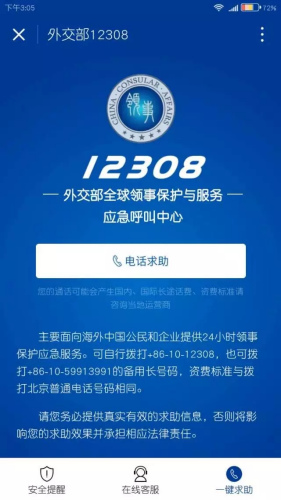 今后在國外遇到任何緊急問題,除撥打領保熱線電話12308之外,還可以通過12308微信版及小程序求助!