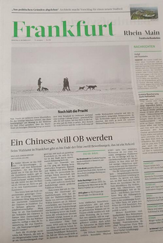 這是12月18日出版的《法蘭克福匯報(bào)》公布的法蘭克福市政府2018年—2024年競選法蘭克福市市長眾多候選人名單文章的標(biāo)題。德文原文是“Ming Yang will OB in Frankfurt werden”。