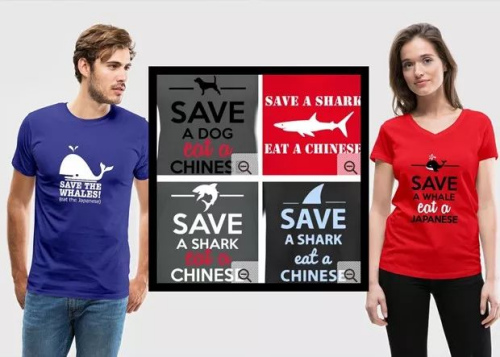 這家德國(guó)公司被指涉嫌種族歧視的多款T恤,上面印著“救一只狗,吃一個(gè)中國(guó)人”(Save A Dog, Eat A Chinese)、“救一條鯊魚,吃一個(gè)中國(guó)人”(Save A Shark, Eat A Chinese),每件售價(jià)25.39歐元。