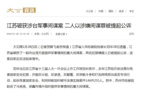 【環(huán)球網(wǎng)綜合報道】據(jù)香港大公網(wǎng)1月28日報道,江蘇省人民檢察院檢察長劉華28日透露,江蘇省破獲了一起向臺灣方面提供軍事情報的重大間諜案,兩名犯罪嫌疑人已被提起公訴,該案目前正在法院審理中。