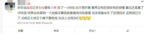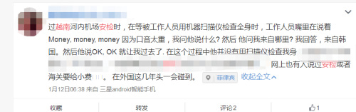 經(jīng)緯君在微博上搜索發(fā)現(xiàn),很多人都有被越南海關(guān)以及安檢人員索要小費(fèi)的遭遇,有人在微博中寫(xiě)到,在河內(nèi)機(jī)場(chǎng)過(guò)安檢時(shí),工作人員嘴里一直念著“money money money”,而自己說(shuō)了是來(lái)自韓國(guó)則可以順利過(guò)關(guān)。
