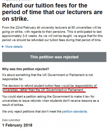 由于老師罷工,不少學(xué)校的學(xué)生向各自的學(xué)校發(fā)起請愿,要求退回罷工期間所交的學(xué)費(fèi),甚至在英國政府和議會的官網(wǎng)發(fā)起請愿。但是這一請愿被英國政府和議會駁回了,理由是“退回學(xué)費(fèi)更多的是學(xué)校的職責(zé),而不是政府和議會?!?/p>