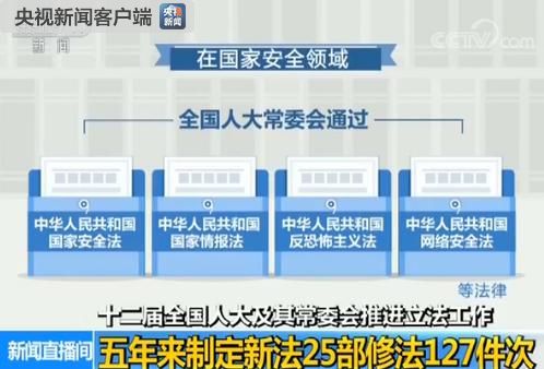 五年以來,十二屆全國人大及其常委會不斷加強和改進立法工作,扎實推進重點領域立法。在國家安全領域,全國人大常委會通過了《國家安全法》、《國家情報法》、《反恐怖主義法》、《網(wǎng)絡安全法》等法律。