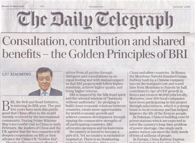 人民網(wǎng)訊 據(jù)外交部網(wǎng)站報道,2018年3月26日,英國主流大報《每日電訊報》紙質(zhì)版和網(wǎng)絡(luò)版同時刊登駐英國大使劉曉明題為《共商共建共享是“一帶一路”的“黃金法則”》的署名文章。全文如下: