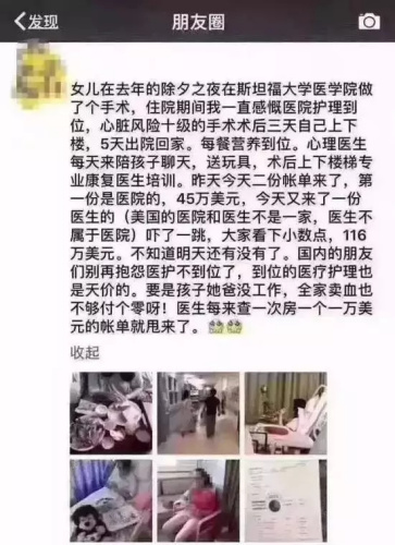 其實,在國外看病被收取“天價”費用的例子還有很多。大家還記得去年一位中國留學生的家長吐槽天價醫(yī)藥費嗎?這位家長的孩子因為心臟問題,在斯坦福大學醫(yī)院接受手術。