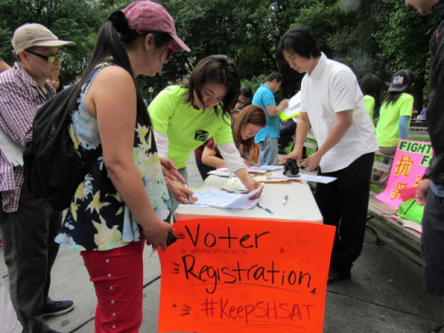 10日在示威抗議會場中,協(xié)助民眾做選民登記的美國紐約華人洗籠協(xié)會(Chinese-American Laundry Association)副會長陳秦官,深感投票的重要性。他指出,去年該協(xié)會成立,就是因為市府頒布不合理法規(guī),導(dǎo)致5000多家洗衣業(yè)者面臨倒閉風險?!斑x出能夠替小區(qū)講話的人很重要,否則萬一突然又有什么不合理的法令頒布下來,小老百姓能上哪里求助?”