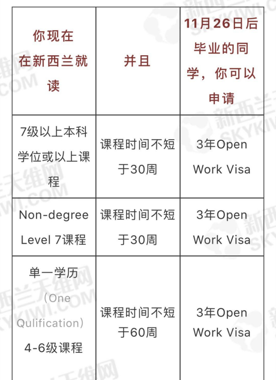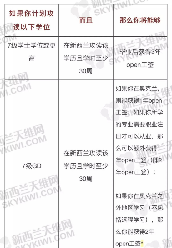 取消所有級別課程的留學(xué)生申請雇主擔(dān)保工簽的權(quán)利;為Level 4-6和non-degree Level 7課程的學(xué)生提供為期1年的open工簽;另外,為那些就讀GD且所學(xué)專業(yè)需要職業(yè)注冊才可以從業(yè)的畢業(yè)生,額外提供1年open工簽;為奧克蘭地區(qū)之外、且在2021年12月前完成學(xué)業(yè)的Level 4-6和non-degree Level 7課程的學(xué)生提供為期2年的open工簽;為Level 7學(xué)士學(xué)位及以上課程的學(xué)生提供為期3年的open工簽;8級課程留學(xué)生的專業(yè)需屬于長期緊缺職業(yè),才能有資格擔(dān)保其配偶申請open工簽,以及其未成年子女免費讀書。