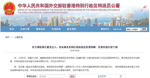 外交部駐港公署回應拒簽英媒記者工作簽證:任何外國無權干涉