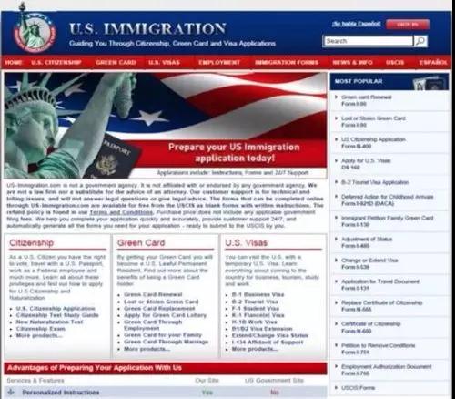 仔細觀察這些網(wǎng)站,他們會使用“美國移民”、“公民身份”和“綠卡”等關(guān)鍵詞來吸引潛在客戶。