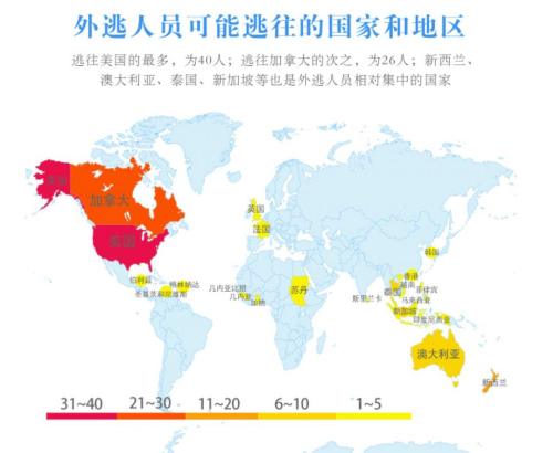 從“百名紅通人員”逃往的國家和地區(qū)看,最多的是美國,有40人;其次為加拿大,有26人;此外,新西蘭、澳大利亞、泰國、新加坡等國家和地區(qū),人數(shù)也較多。