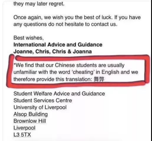 有網(wǎng)友直接回懟利物浦大學的做法:“我一個沒過四級的學生都知道Cheating是‘欺騙、作弊’的意思,你們竟然說留學生不知道什么意思?”