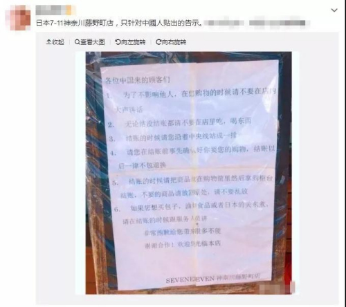 在日本神奈川藤野町的一家便利店,有中國游客看到在該便利店門口直接貼出中文告示,直指“中國來的顧客們”,提醒他們不要在店內(nèi)大聲說話、不要在店里吃喝東西、排隊時請排成一排……