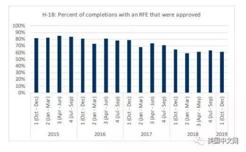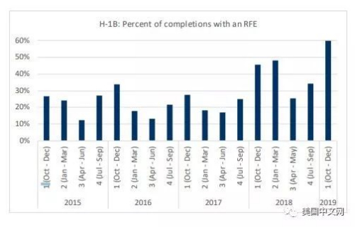 根據(jù)這份周五公布的數(shù)據(jù),在2018年第四季度,移民局向60%、即超過(guò)6萬(wàn)個(gè)H-1B申請(qǐng)案例發(fā)出過(guò)補(bǔ)件要求(RFE),而2017年申請(qǐng)人收到RFE的比率為46%,再前一年為28%,顯然逐年大幅度增加。