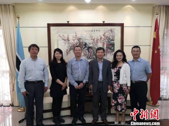 當(dāng)?shù)貢r間3月8日,中國駐博茨瓦納大使趙彥博(右三)在哈博羅內(nèi)會見到訪的中國新聞社副社長、副總編夏春平(左三)一行?!∮诰Р?攝