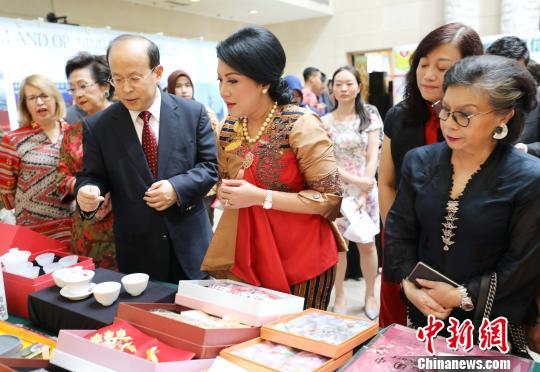 中國駐印尼使館展臺(tái)布設(shè)精巧,富有中國特色,展銷的手繡絲巾、刺繡折扇、景德鎮(zhèn)瓷器等中國傳統(tǒng)工藝品和中國茶葉、酒、特色小吃等廣受歡迎。