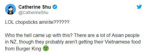 隨后這則廣告視頻被一位韓裔新西蘭人轉(zhuǎn)發(fā)到推特上,漢堡王在廣告中取笑筷子的行為令許多網(wǎng)友感到憤怒??曜邮莵喼薷髅褡鍞?shù)千年來(lái)一直使用的一種餐具。世界各地的亞洲社區(qū),都用筷子吃飯。外國(guó)網(wǎng)友紛紛指責(zé)漢堡王“對(duì)文化不敏感”和“種族歧視”,還有一些人稱該廣告讓筷子看起來(lái)“笨拙”、“低級(jí)”和“愚蠢”。
