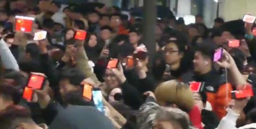 華僑華人和留學生們舉起手機、平板屏幕上的國旗點亮了雨夜。