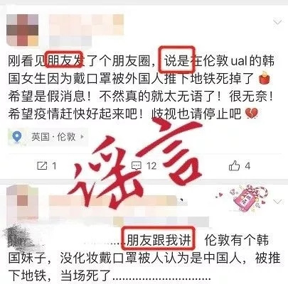 謠言:近日,一條關(guān)于“一個(或兩個)韓國女生因戴口罩在意大利被推到鐵軌上喪生”的消息刷遍朋友圈。朋友圈中眾說紛紜:“英國UAL(倫敦藝術(shù)大學(xué))的一個(或兩個)韓國女生因為戴口罩被推下鐵軌,死了,已經(jīng)證實了!”到了當(dāng)晚,朋友圈又開始傳“昨天和今天各發(fā)生了一起,兩個都是韓國女生,因為戴口罩被推到地鐵軌道”。