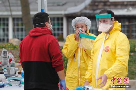 當?shù)貢r間3月18日,美國紐約州拿騷縣的一處醫(yī)療中心戶外停車場正在進行免下車新冠病毒檢測,醫(yī)務(wù)人員工作交流。目前,紐約州有部分地點推行免下車新冠病毒檢測,該測試需要通過預約評估方可到現(xiàn)場檢測。 中新社記者 廖攀 攝