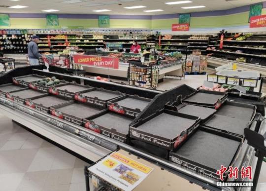當?shù)貢r間3月17日,美國舊金山灣區(qū)圣馬特奧縣一家超市的多種商品供不應求。中新社記者 劉關(guān)關(guān) 攝