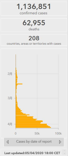 世衛(wèi)組織實(shí)時(shí)統(tǒng)計(jì)數(shù)據(jù)顯示,截至歐洲中部時(shí)間4月5日18時(shí)(北京時(shí)間4月6日0時(shí)),全球確診新冠肺炎1136851例,死亡62955例,目前全球已有208個(gè)國(guó)家和地區(qū)出現(xiàn)新冠肺炎確診病例,中國(guó)以外超過(guò)105萬(wàn)例。(總臺(tái)記者 朱赫)